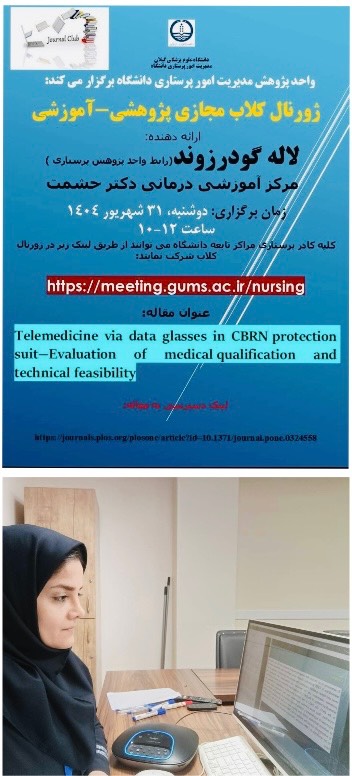 به گزارش روابط عمومی مدیریت امور پرستاری دانشگاه علوم پزشکی گیلان:ژورنال کلاب پژوهشی -آموزشی مجازی مدیریت امور پرستاری دانشگاه برگزار شد.  ژورنال کلاب پژوهشی -آموزشی مدیریت امور پرستاری دانشگاه به صورت مجازی با حضور کارشناسان ستادی و اعضای هسته های پژوهش مراکز تابعه با عنوان"Telemedicine via data glasses in CBRN protection suit_Evaluation of medical qualification and technical feasibility" روز دوشنبه سی و یکم شهریور ماه ۱۴۰۴ از ساعت ۱۰ الی ۱۲ برگزار شد. این ژورنال کلاب با رویکرد پرستاری در بحران ها و با هدف توجه بیشتر به رویکرد های مبتنی بر شواهد به صورت مجازی برگزار و مقاله مذکور از نظر ویژگی های پژوهشی و آموزشی توسط لاله گودرزوند رابط واحد پژوهش پرستاری بالینی مرکز آموزشی درمانی دکتر حشمت مورد نقد و بررسی قرار گرفت.