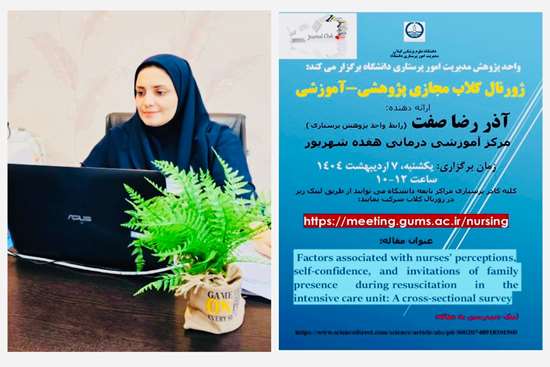 ژورنال کلاب پژوهشی -آموزشی مجازی مدیریت امور پرستاری دانشگاه برگزار شد. نخستین ژورنال کلاب پژوهشی -آموزشی مدیریت امور پرستاری دانشگاه در سال جدید به صورت مجازی با حضور کارشناسان ستادی و اعضای هسته های پژوهش مراکز تابعه با عنوان"Factors associated with nurses's perceptions,self-confidence,and invitations of family presence during resuscitation in the intensive care unit:A cross-sectional survey"روز یکشنبه هفتم اردیبهشت ماه ۱۴۰۴ از ساعت ۱۰ الی ۱۲ برگزار شد. این ژورنال کلاب با هدف توجه بیشتر به رویکرد های مبتنی بر شواهد به صورت مجازی برگزار و مقاله مذکور از نظر ویژگی های پژوهشی و آموزشی توسط آذر رضاصفت رابط واحد پژوهش پرستاری بالینی مرکز آموزشی درمانی هفده شهریور مورد نقد و بررسی قرار گرفت.